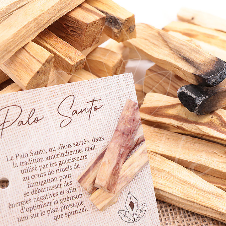 Le palo santo, littéralement “bois sacré”, est issu d’un arbre originaire d’Amérique du Sud. Contrairement à la sauge blanche, il n’est pas utilisé pour nettoyer de manière intense, mais plutôt pour harmoniser, apaiser et élever l’énergie d’un lieu ou d’un moment.