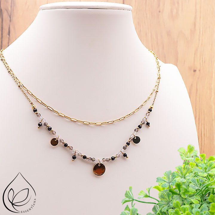 Collar Iris dorado con turmalina negra y cristal de roca ahumado AA