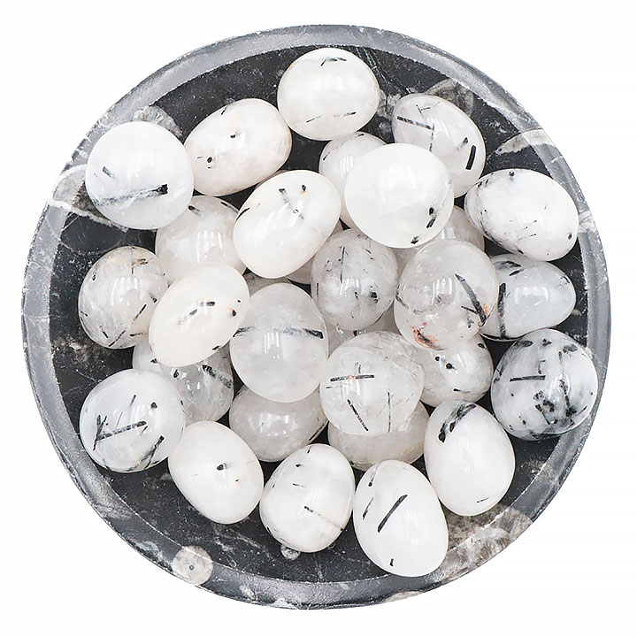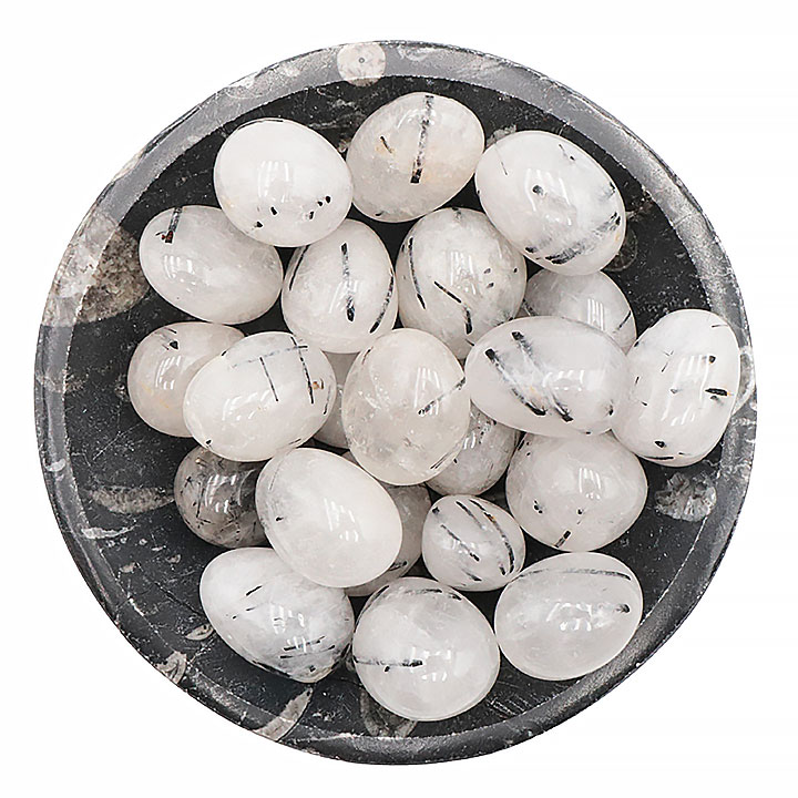 Brazaletes de cristal de roca turmalina. Piedras rodadas blancas y negras.