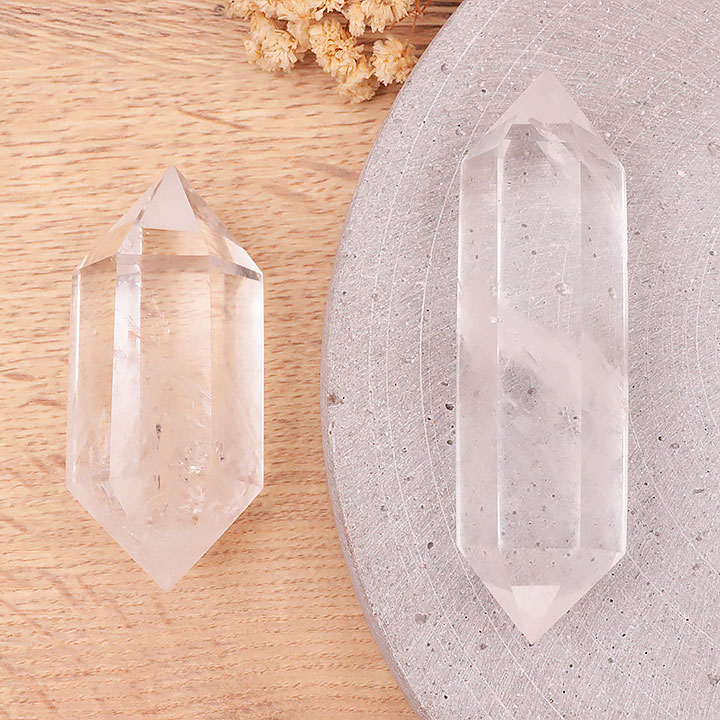Pulseras y colgantes en cristal de roca. Perlas, piedras rodadas y puntas de cristal de roca.