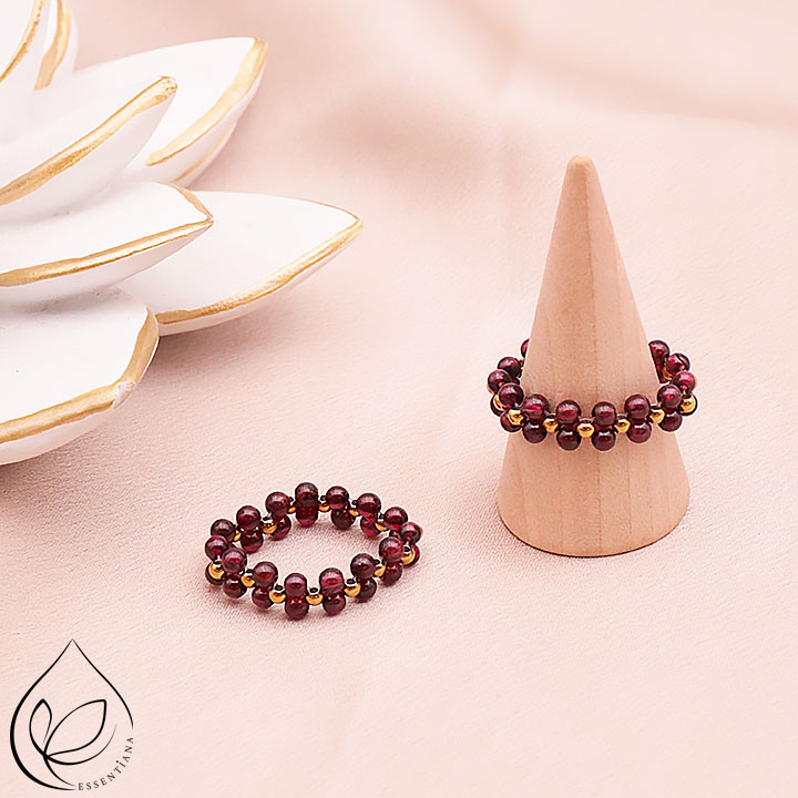 Pulseras y colgantes de granate rojo. Cuentas sobre alambre y piedras rodadas de granate rojo.