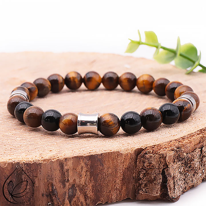 Pulseras y colgantes de piedra de ojo de tigre. Perlas sobre alambre, guijarros y piedras perforadas con ojo tigre.