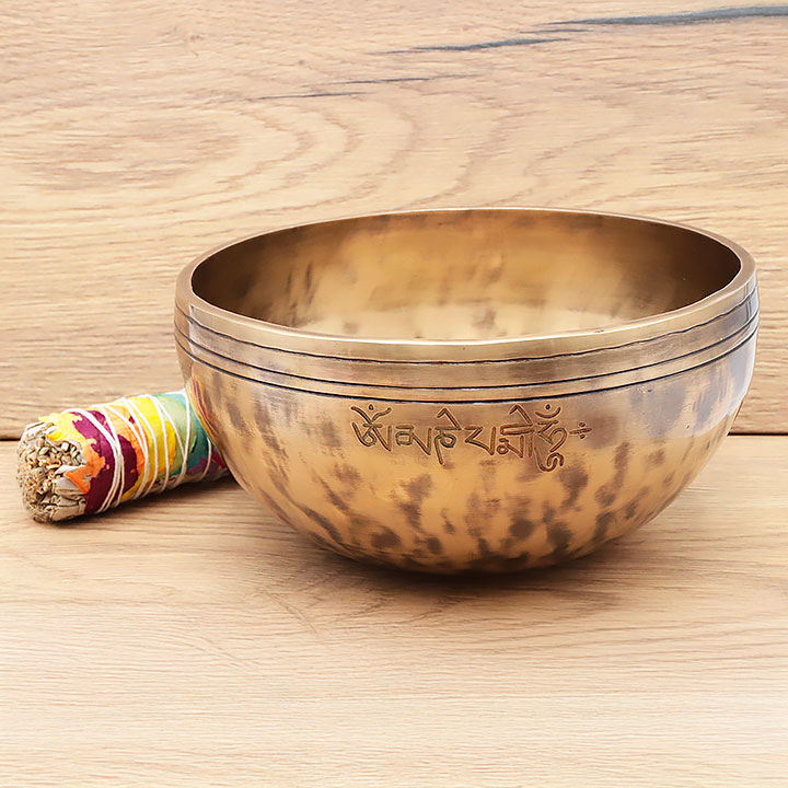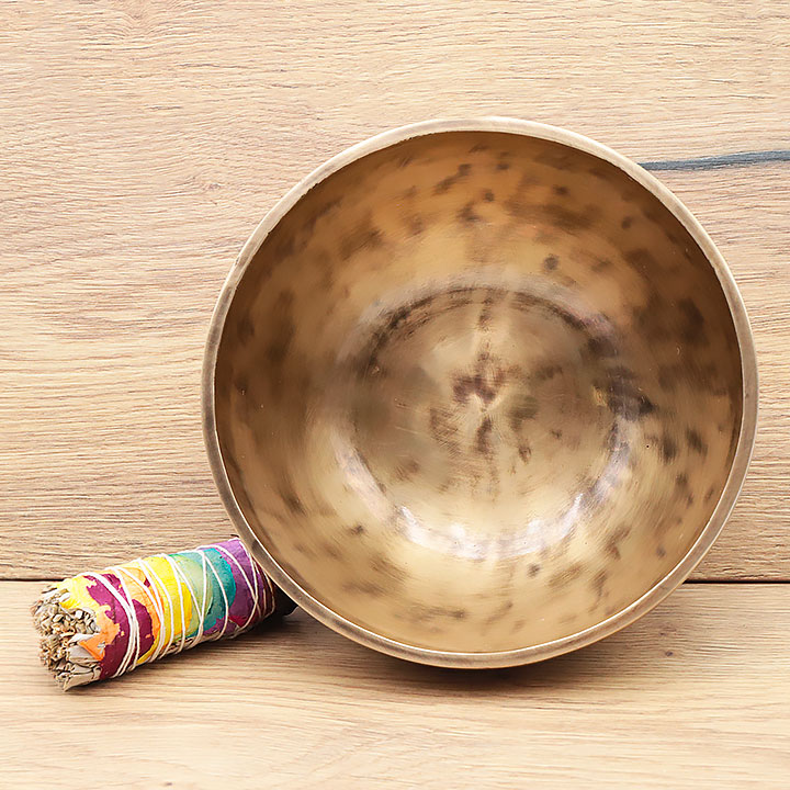 *Cuenco cantante fabricado de manera artesanal con una aleación de calidad superior para una resonancia profunda y duradera. Compuesto por un 98% de bronce puro (cobre 72% estaño 26%); complementado con pequeñas trazas de aleaciones metálicas tradicionales (hierro, zinc, aluminio...) para mejorar el timbre y la duración de la nota.