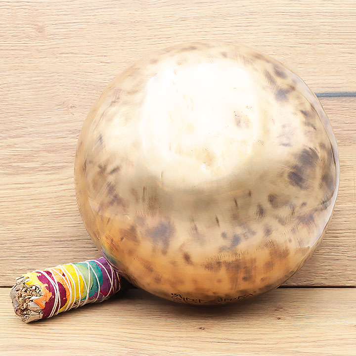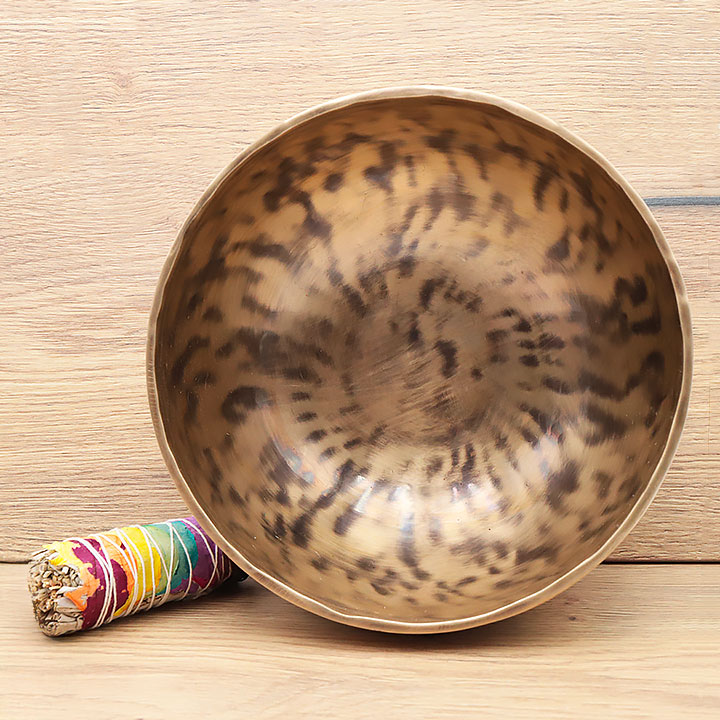*Cuenco tibetano fabricado de manera artesanal con una aleación de calidad superior para una resonancia profunda y duradera.Compuesto por 98% de bronce puro (cobre 72% y estaño 26%); complementado con leves trazas de aleaciones metálicas tradicionales (hierro, zinc, aluminio...) para mejorar el timbre y la sujeción de la nota.