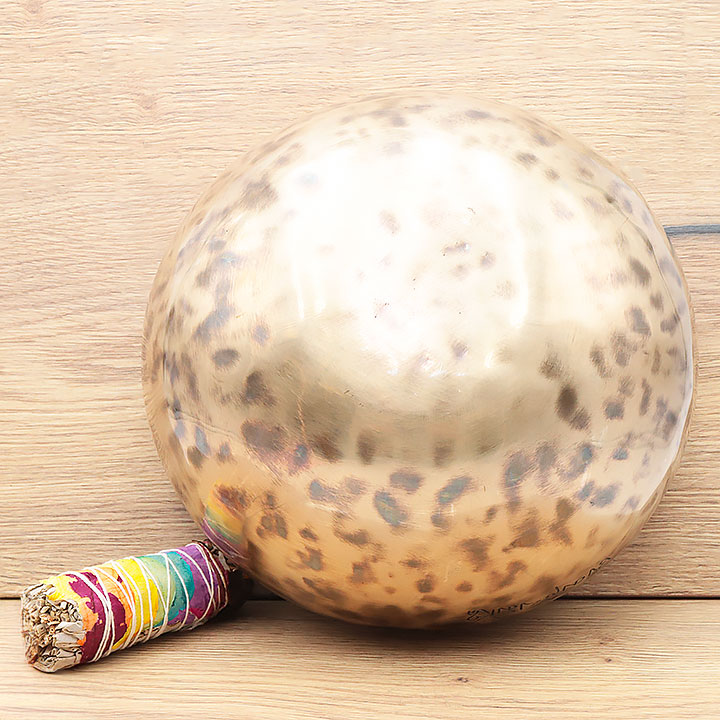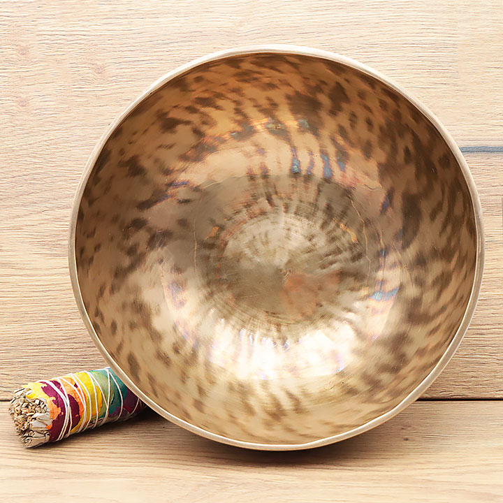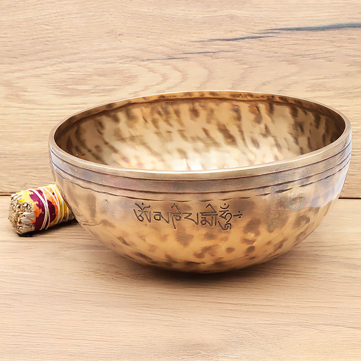 *Cuenco tibetano fabricado artesanalmente con una aleación de calidad superior para una resonancia profunda y duradera.Compuesto por 98% de bronce puro (72% cobre, 26% estaño); complementado con pequeñas trazas de aleaciones metálicas tradicionales (hierro, zinc, aluminio...) para mejorar el timbre y el sostenido de la nota.