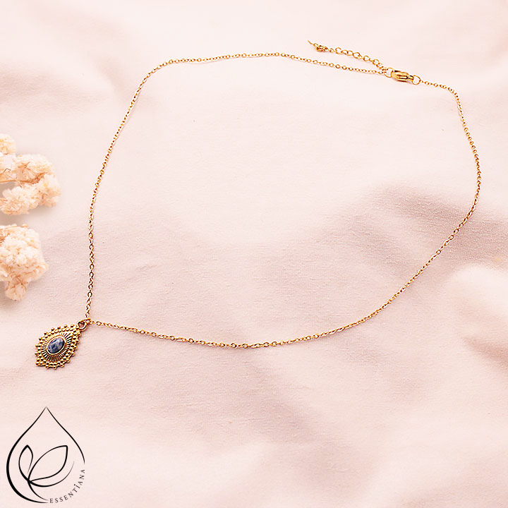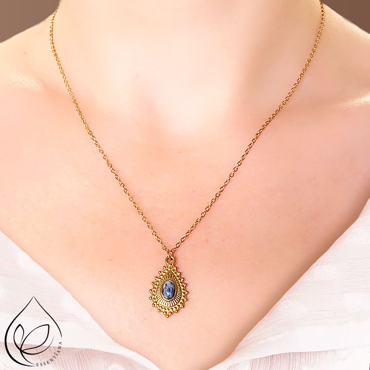 Tamaño del collar: 44 a 49cm Tamaño de la piedra (en mm): aproximadamente 04x06 Tamaño del colgante (en mm): aproximadamente 14x22 Metal: Acero Inoxidable. ✔ Inox 304 – Calidad profesional Nuestros joyas están realizadas en acero inoxidable 304, la referencia mundial para joyas duraderas e hipoalergénicas. Esta aleación garantiza brillo, resistencia y comodidad diaria. *Para preservar sus joyas, evite el contacto con el agua.
