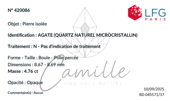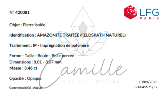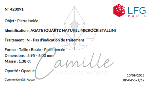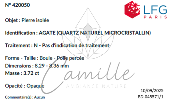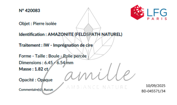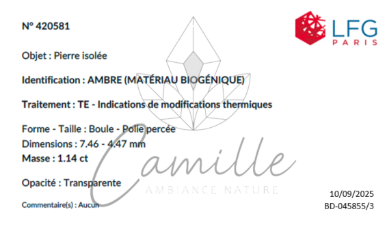 Cuando recibimos un nuevo lote de minerales, seleccionamos una o varias muestras de todo el lote y las enviamos a LGF para su análisis. Hemos adoptado este método de trabajo para garantizar la máxima seguridad en cuanto a la calidad y autenticidad de nuestras piedras. Nos gustaría señalar que, dado el coste de los análisis, es obviamente imposible hacer tasar cada piedra o perla vendida. Sin embargo, este método de tasación nos permite realizar comprobaciones periódicas, lo que favorece la sinceridad de nuestros proveedores y la confianza de nuestros clientes.