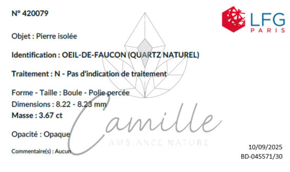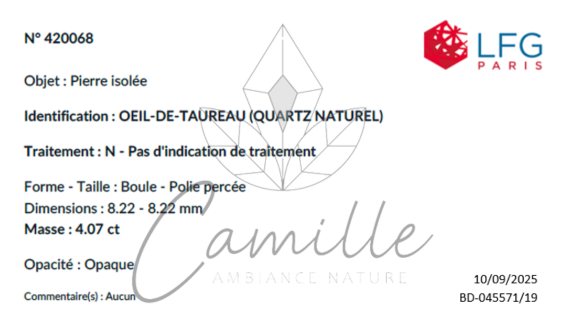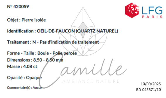 Cuando recibimos un nuevo lote de minerales, seleccionamos una o varias muestras de todo el lote y las enviamos a LGF para su análisis. Hemos adoptado este método de trabajo para garantizar la máxima seguridad en cuanto a la calidad y autenticidad de nuestras piedras. Nos gustaría señalar que, dado el coste de los análisis, es obviamente imposible hacer tasar cada piedra o perla vendida. Sin embargo, este método de tasación nos permite realizar comprobaciones periódicas, lo que favorece la sinceridad de nuestros proveedores y la confianza de nuestros clientes.